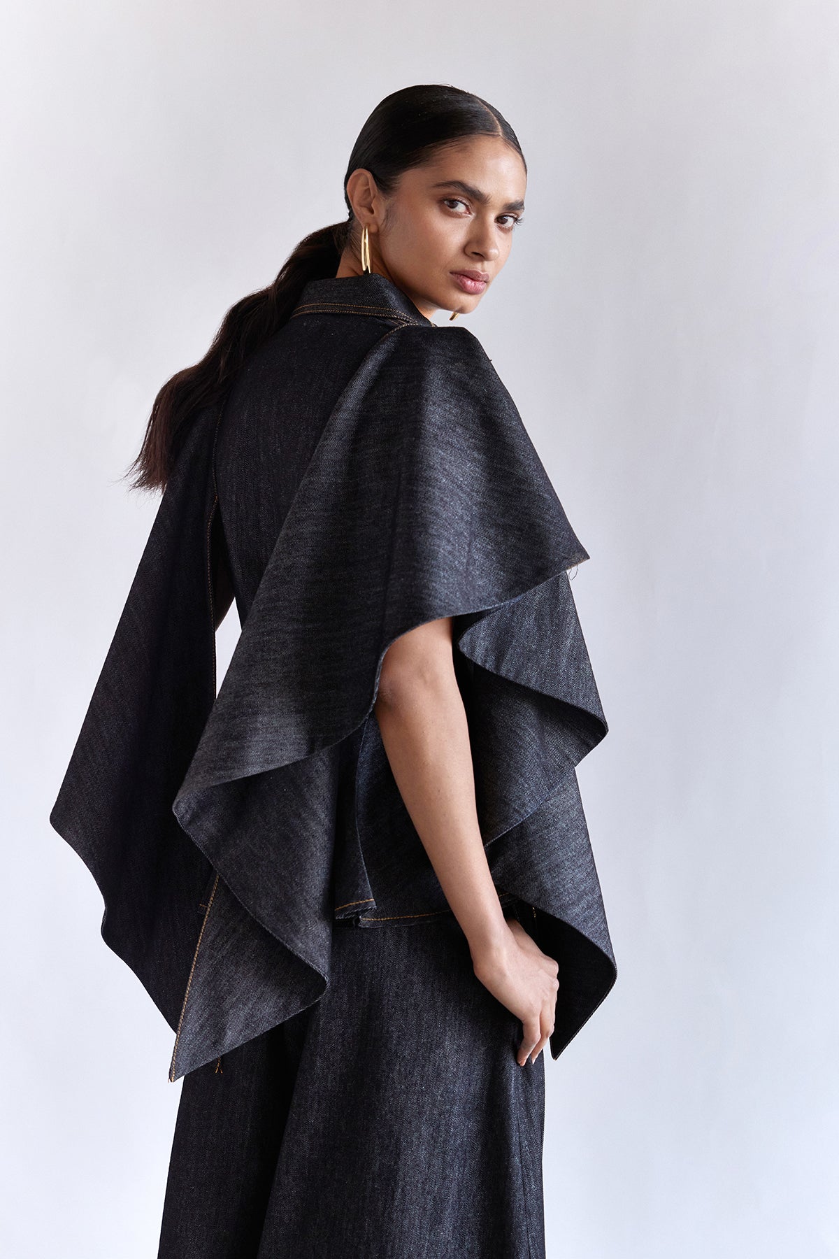 A sculpted black denim top featuring a sharp V-collar, gold hardware, and a soft peplum flare. Dramatic shoulder flaps fall like architectural wings, adding signature ANI volume and movement. Clean lines, contrast stitches, and asymmetric panels complete this elevated statement piece.