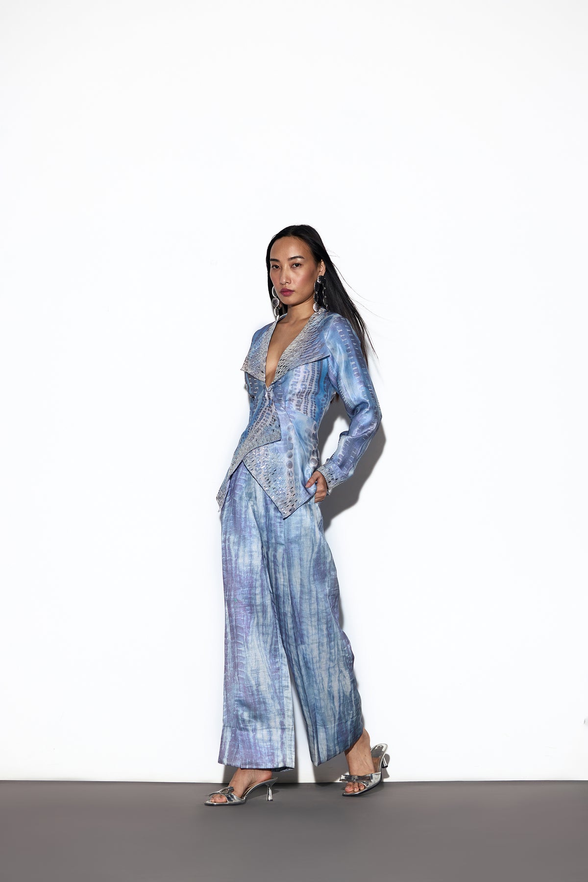 The EMI TROUSER embody effortless elegance with their wide-leg silhouette. Tailored with a front button and zipper closure, they offer structure while side inseam pockets add functionality. A single pleat on each side enhances their shape, creating subtle rhythm with every step. Relaxed yet refined, these trousers balance ease with sophistication, completing the set with timeless charm.