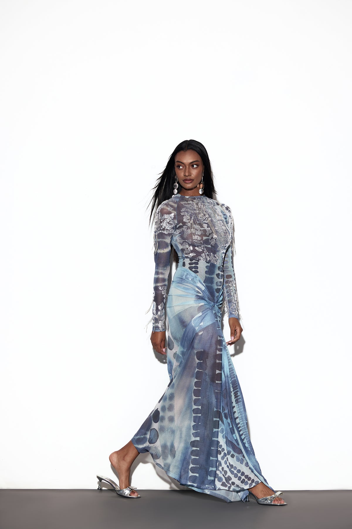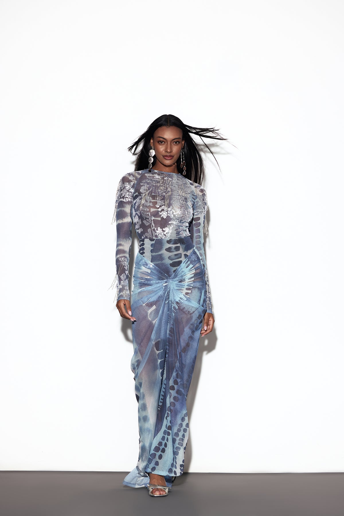 The MIMI BODYSUIT is a luminous embrace of elegance and allure. With its round neckline and full sleeves, it hugs the curves like a second skin, while the backless design, secured with a delicate hook-and-eye closure, adds a whisper of intrigue. Silver sequins glimmer softly across the fabric, and hanging silver beads sway with every movement, catching the light like starlight in motion. A piece that feels both sensual and ethereal, designed to make every moment shimmer with quiet radiance.