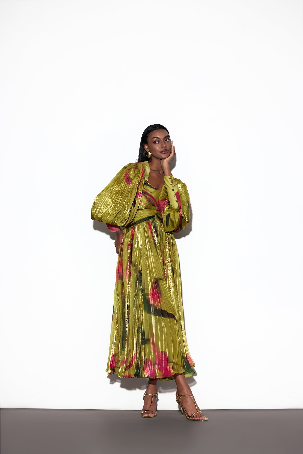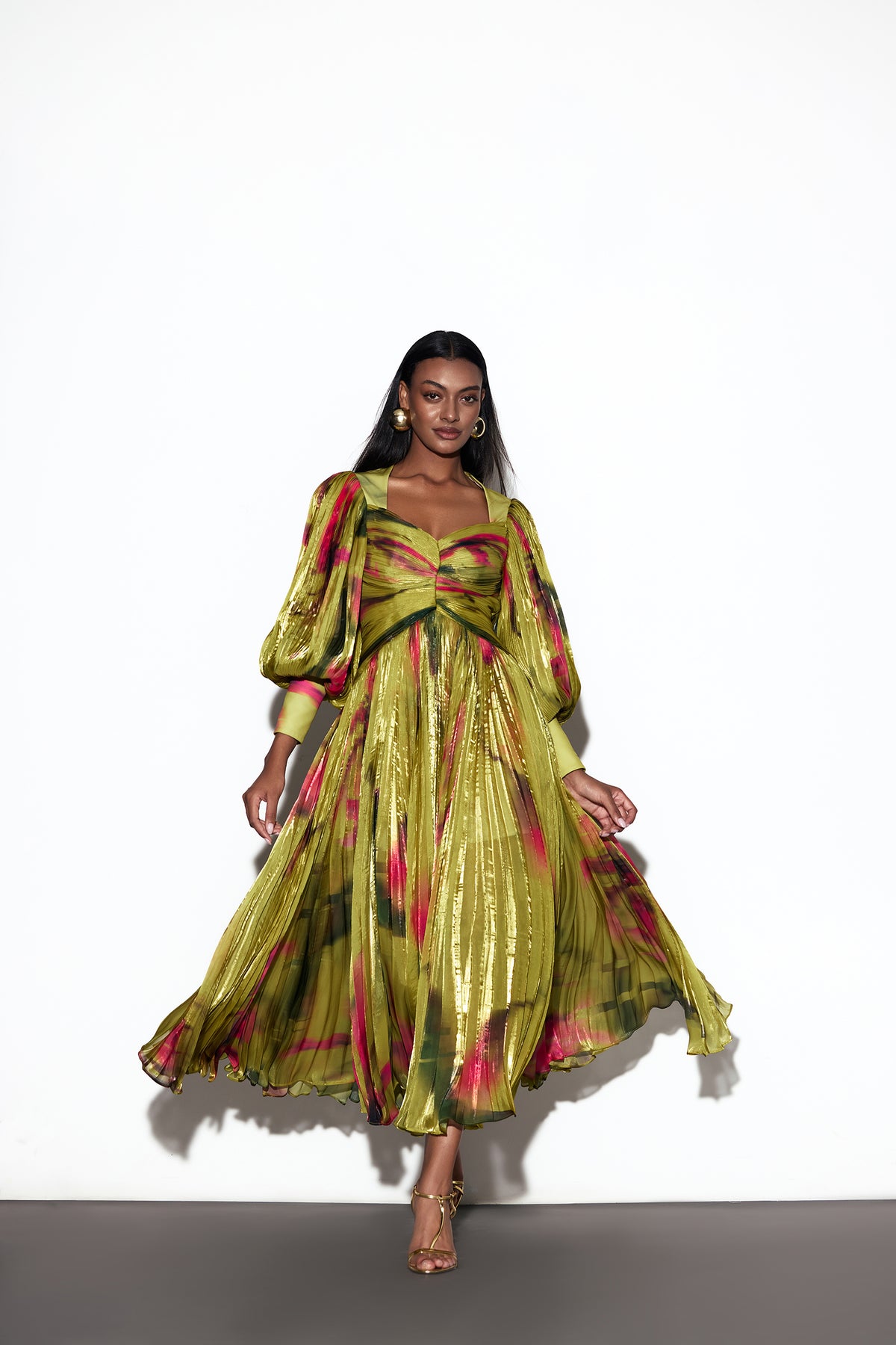 The IZUMI DRESS is a whisper of grace and allure. A sweetheart neckline frames the silhouette with soft femininity, flowing into a pleated body that moves like quiet rhythm. Pleated bishop sleeves, gathered into long cuffs with delicate fabric buttons, bring timeless romance to the design. The pleated A-line bottom completes the look, sweeping with effortless charm, while a concealed back zipper ensures a seamless fit. A piece that lingers between classic elegance and modern poise.