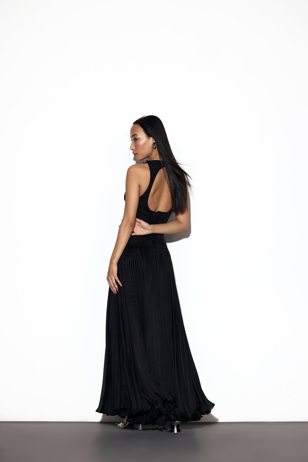The AYUMI DRESS is a vision of starry elegance. With a plunging neckline and backless detail, it frames the silhouette with daring sophistication. The fitted, pleated bodice is adorned with black sequin floral patterns and scattered silver sequins, glimmering like a starry night across the fabric. Flowing into a pleated bottom, the dress moves with effortless grace, while a back button closure at the neck and a zipper at the waist ensure a seamless fit. Bold yet luminous, the Ayumi Dress is a celebration of elegance that sparkles with every step.