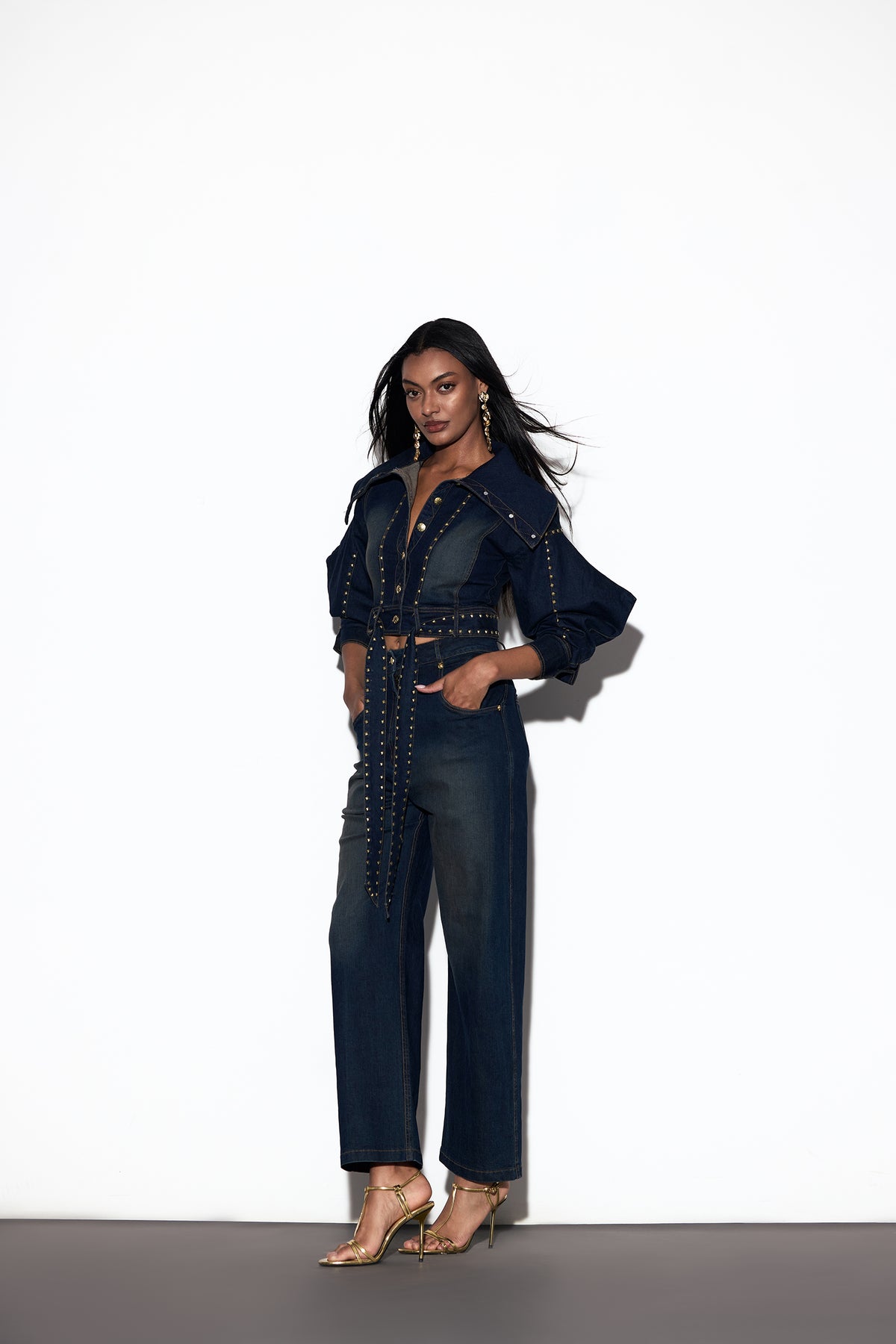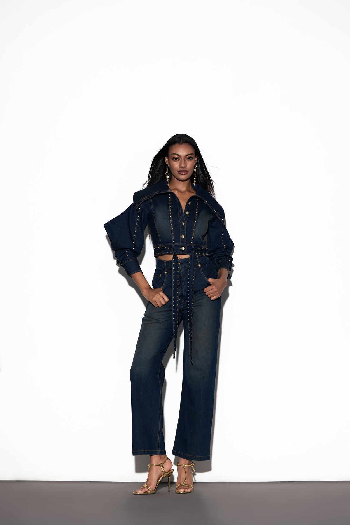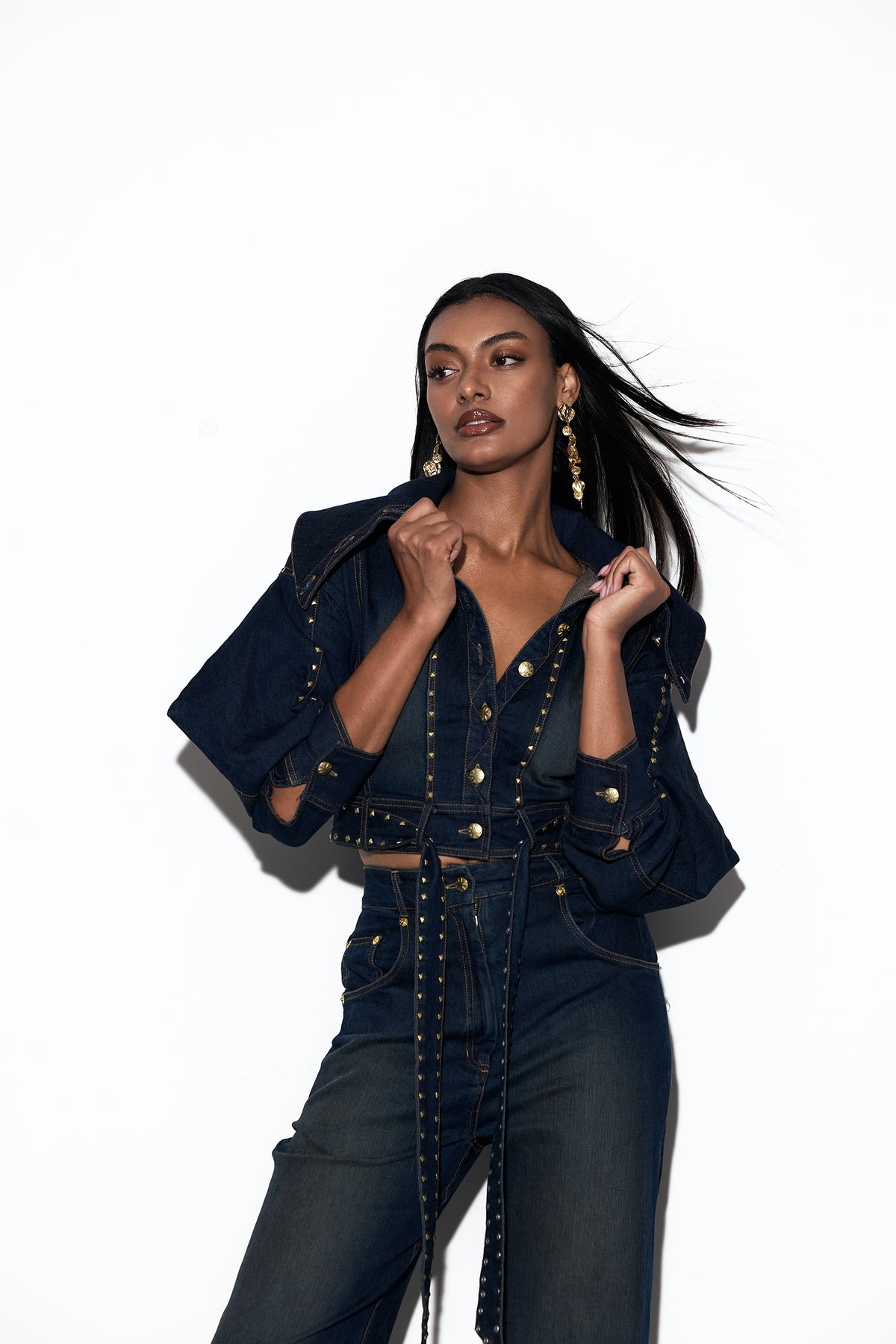 The KOYUKI JACKET is a striking piece of tailored design, defined by its exaggerated collared neckline and full sleeves with pointed edges. A front button-down closure keeps the silhouette clean, while an attached belt cinches the waist for a structured finish. Rivets tracing along the sleeve seams, front body seam, and belt add a bold, gleaming touch, making this jacket both powerful and refined.