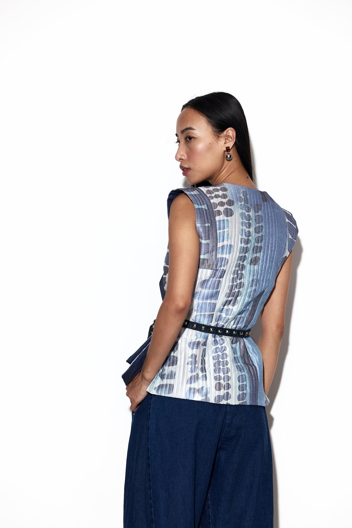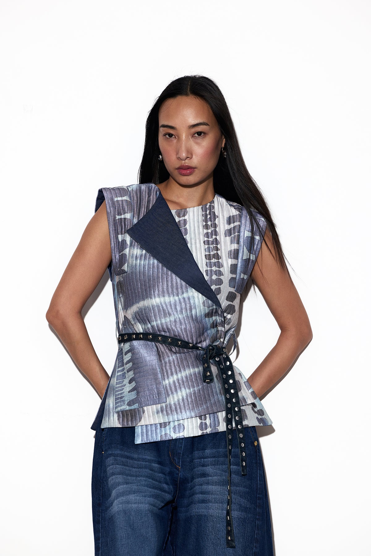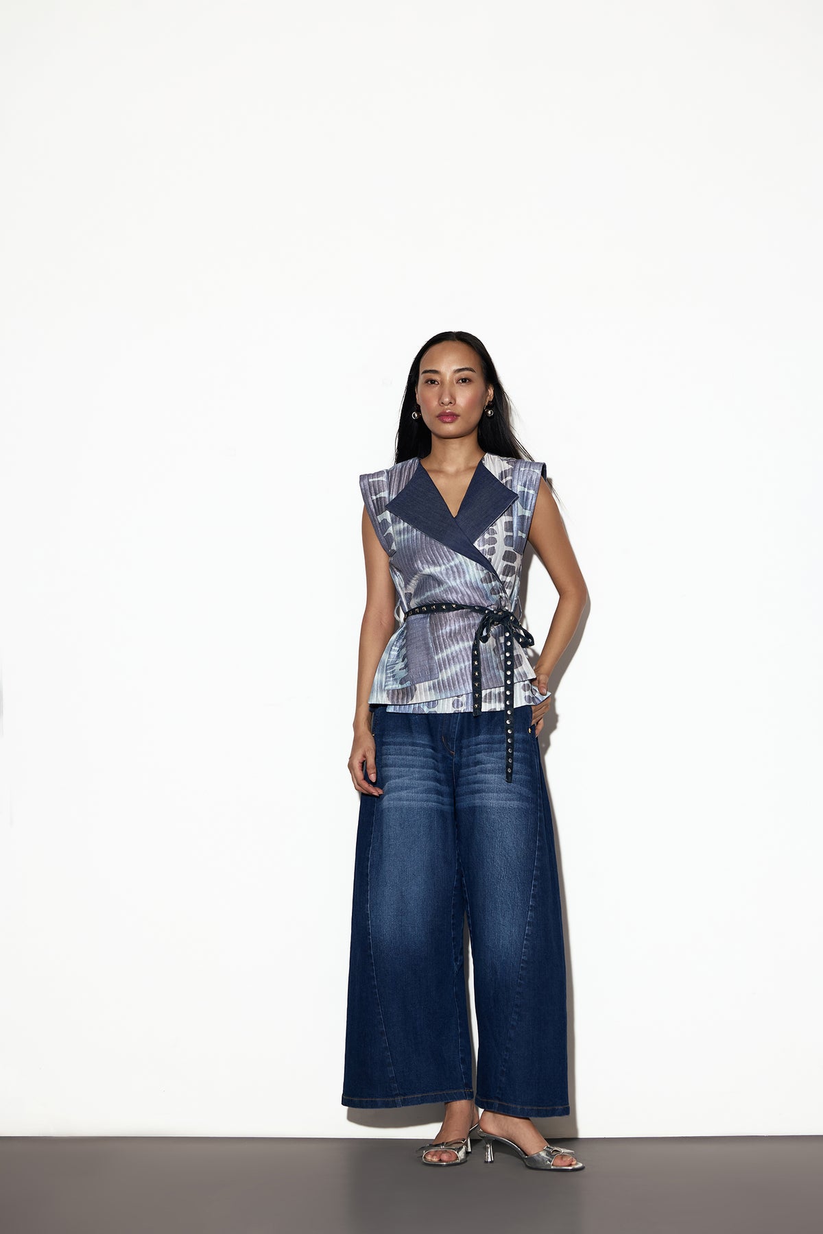 The KUMO SET is a fusion of texture, structure, and modern edge. The sleeveless Kumo Jacket features an overlapping front panel with a single fabric button closure, crafted in quilted fabric on the outside and lined with sleek denim on the inside. Patch pockets add subtle detail, while a denim belt studded with silver rivets cinches the waist, enhancing the tailored silhouette. Paired with wide-legged denim Kumo Trousers, the asymmetrical waist with button and zipper closure sculpts the form, while side inseam pockets and rivets around the pockets add both functionality and understated sparkle. Together, the set balances playful tailoring with contemporary sophistication, perfect for a confident, modern look.