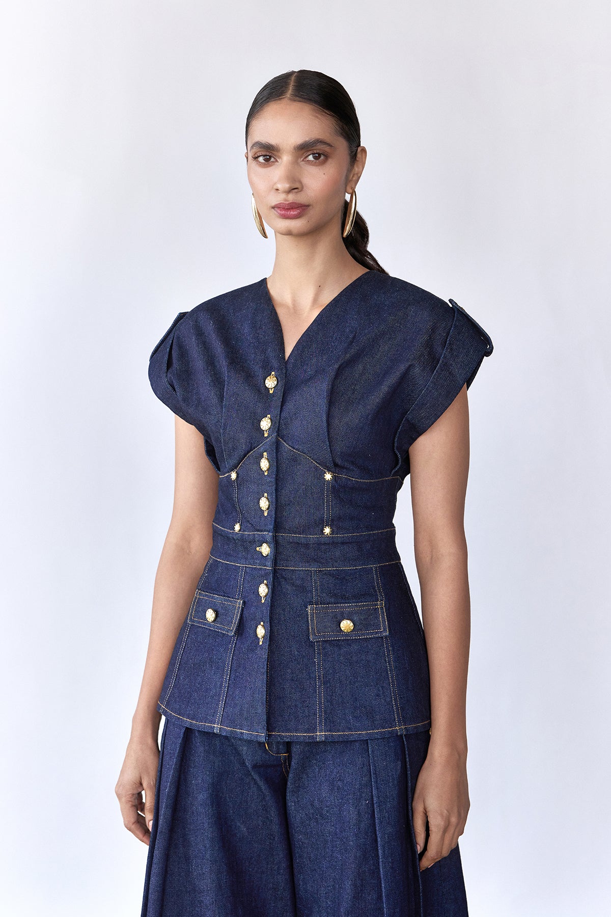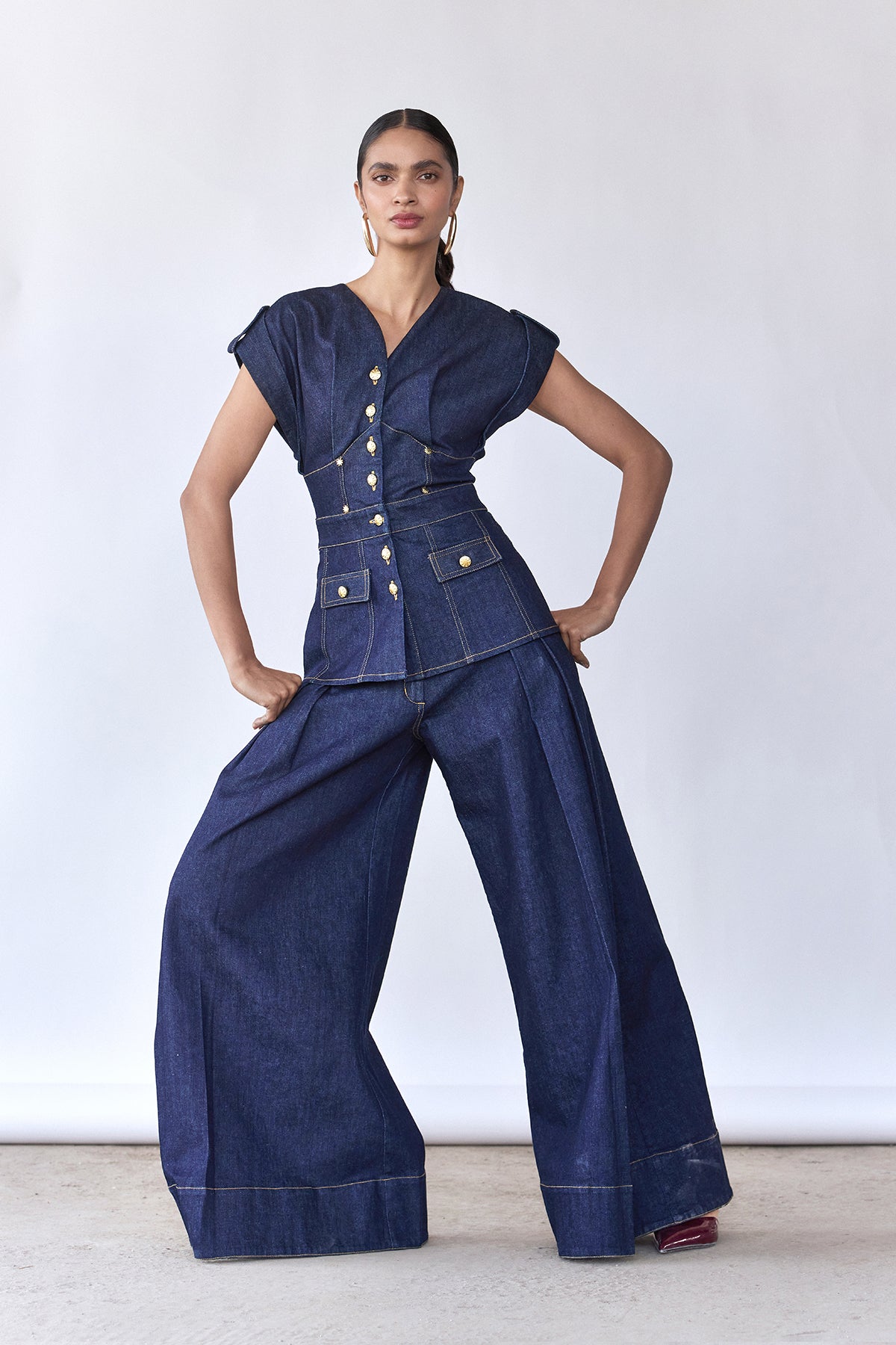 Gold-tone buttons and flap pockets add refined detailing, balancing utility elements with modern sophistication. Designed to pair effortlessly with wide-leg denim trousers, it stands strong as a statement piece for day-to-evening styling.