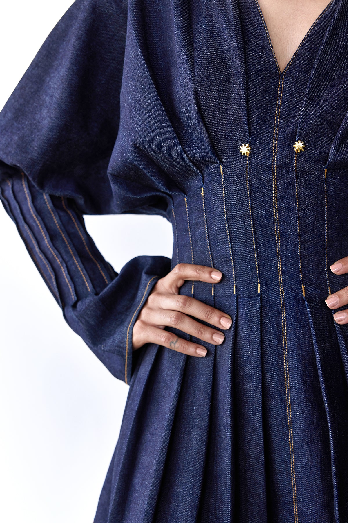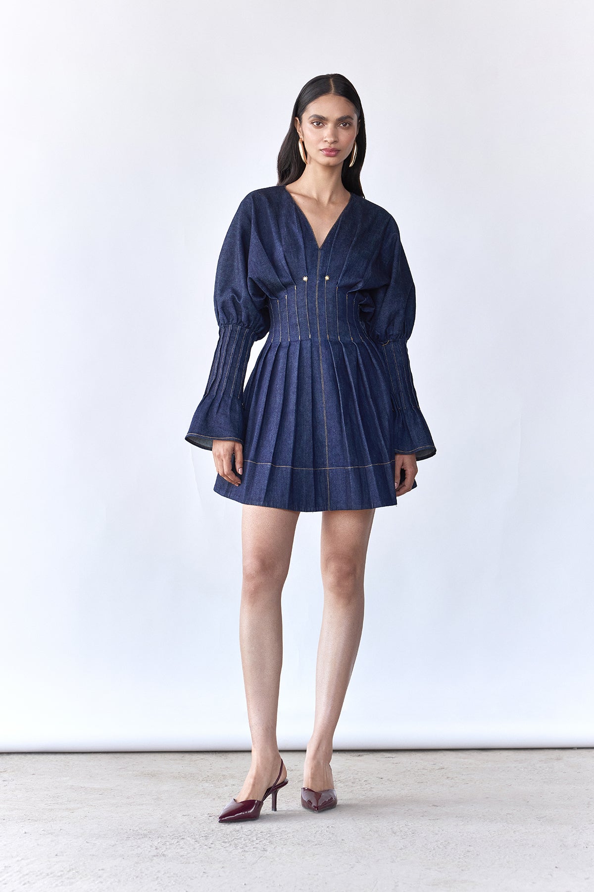 This denim mini dress blends structured pleating with soft volume for a modern, sculpted silhouette. The V-neckline and billowed sleeves add feminine ease, while the cinched waist and fine contrast stitching offer tailored refinement. A standout piece for effortless day-to-evening dressing.
