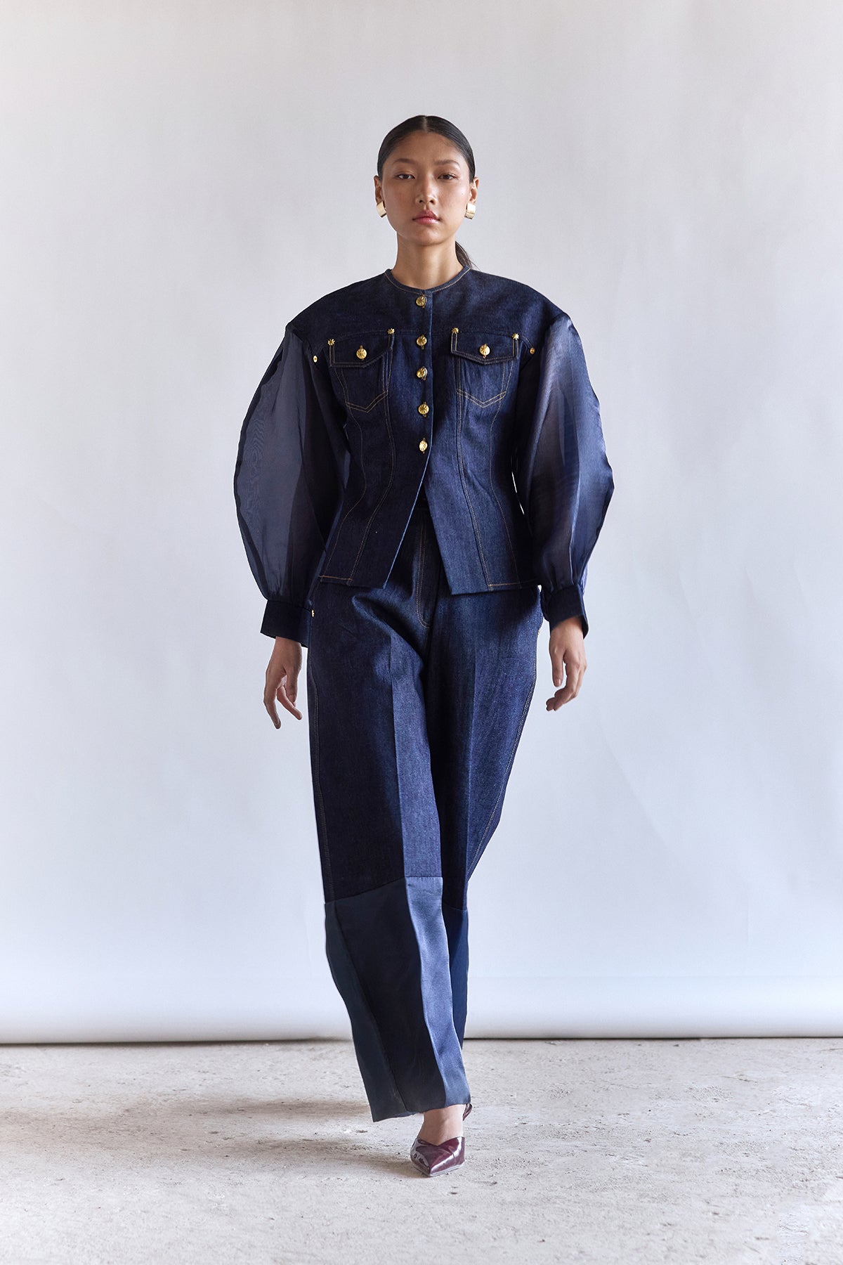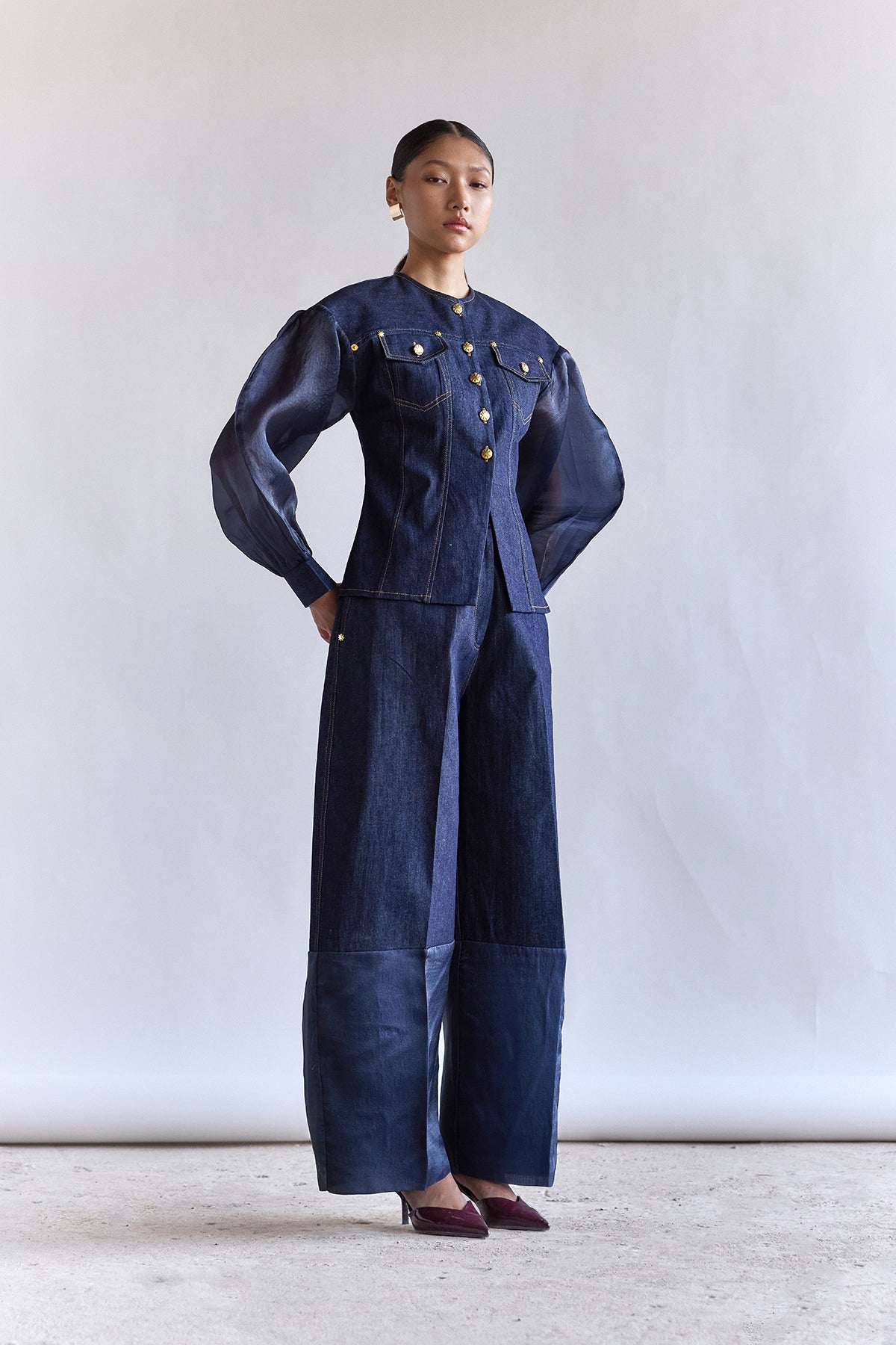 A refined denim set that pairs tailored structure with soft transparency. The fitted top features sheer sleeves, precise panelling, and gold-tone buttons, creating a sharp yet understated silhouette. Balanced with wide-leg trousers, the look is modern, composed, and quietly statement-making.