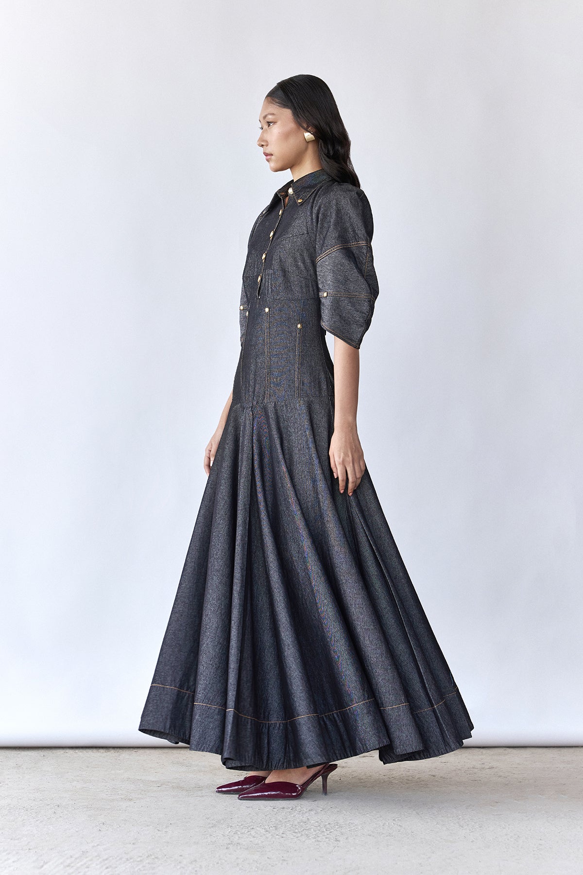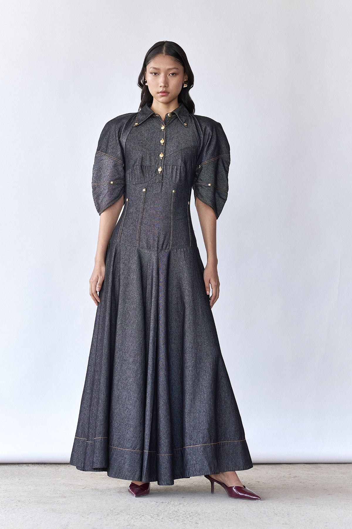 The Lyra Dress is crafted in deep charcoal denim, defined by sculptural sleeves and refined tailoring. The collared bodice features soft gathers and gold-tone buttons, adding subtle structure and contrast. A paneled, contoured waist falls into a full flared skirt, creating a long, fluid silhouette with effortless movement.