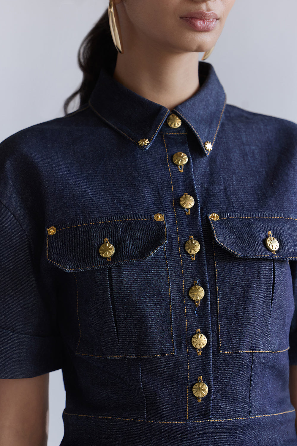 A structured denim mini dress designed with a sharp, utility-inspired edge. Featuring a tailored bodice, short sleeves, and a clean A-line silhouette, it blends polish with everyday ease. Gold-tone buttons and oversized flap pockets add signature ANI detailing, giving the dress a refined yet functional look.