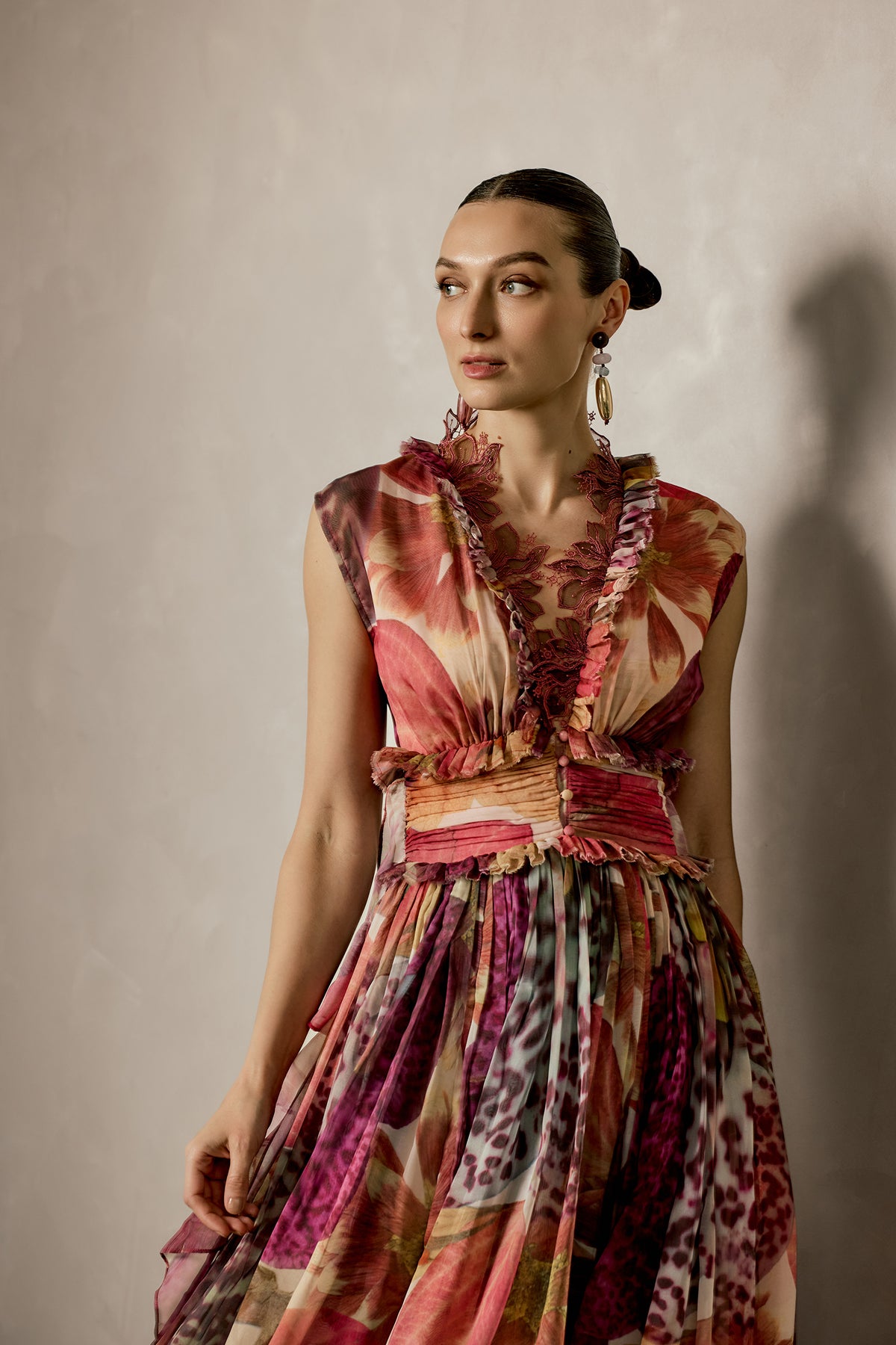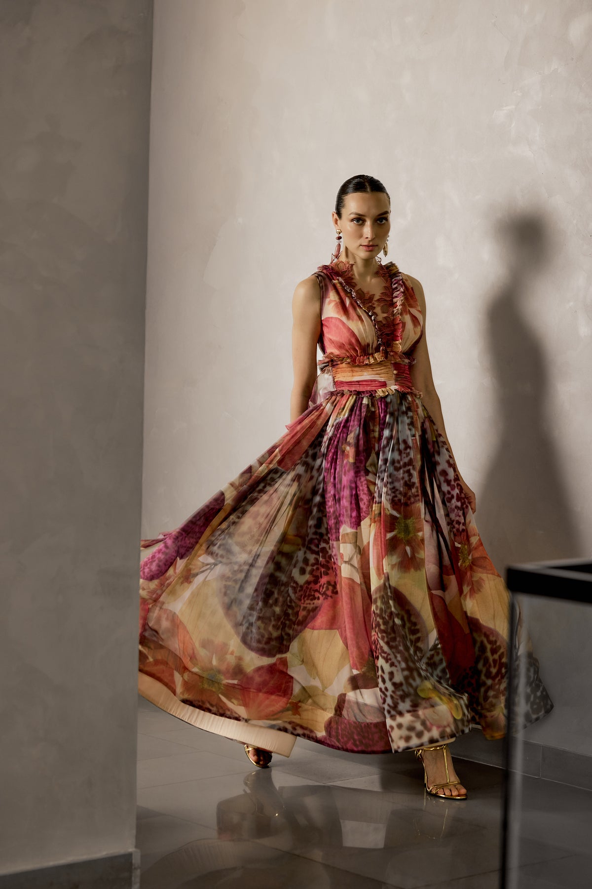 This multi-tonal gown captures a free-spirited elegance with a refined edge. The softly structured bodice, adorned with delicate ruffle accents, flows seamlessly into a voluminous skirt. Designed for moments that embrace individuality.