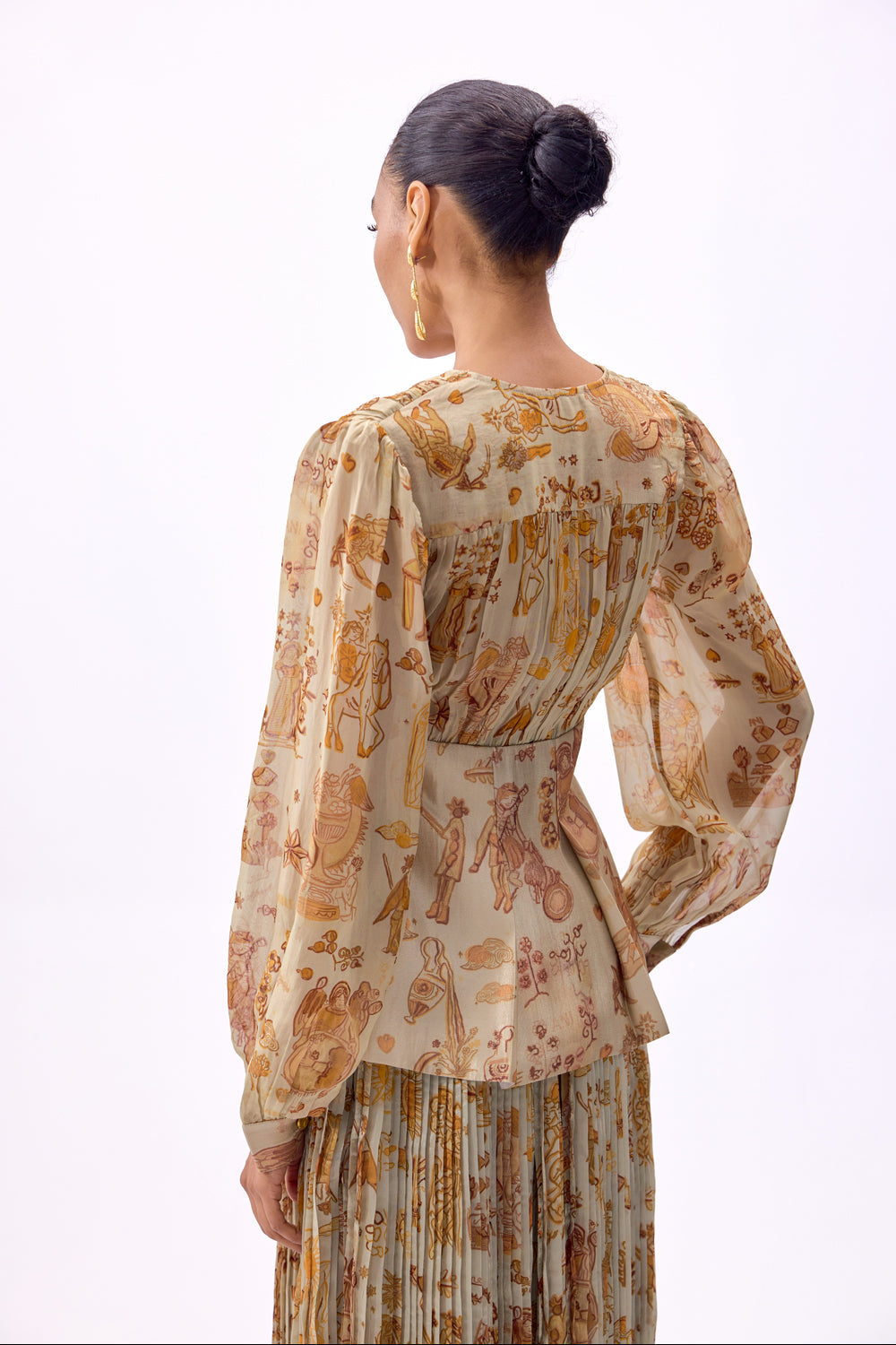 Sand Solstice on Viscose Organze and Moonlit Champagne Silk. ANI's Solstice prints channel the raw power and mystique of the solstice-a moment when the sun stands still and the veil between worlds feels thin. Inspired by the oracle and the arcana, the design evokes celestial magic and ancient wisdom. Sun symbols, ethereal figures, and cosmic motifs form a tapestry that captures the energy of the heavens. It speaks to the timeless rhythm of the universe, where the solstice marks a powerful shift, a turning point.
