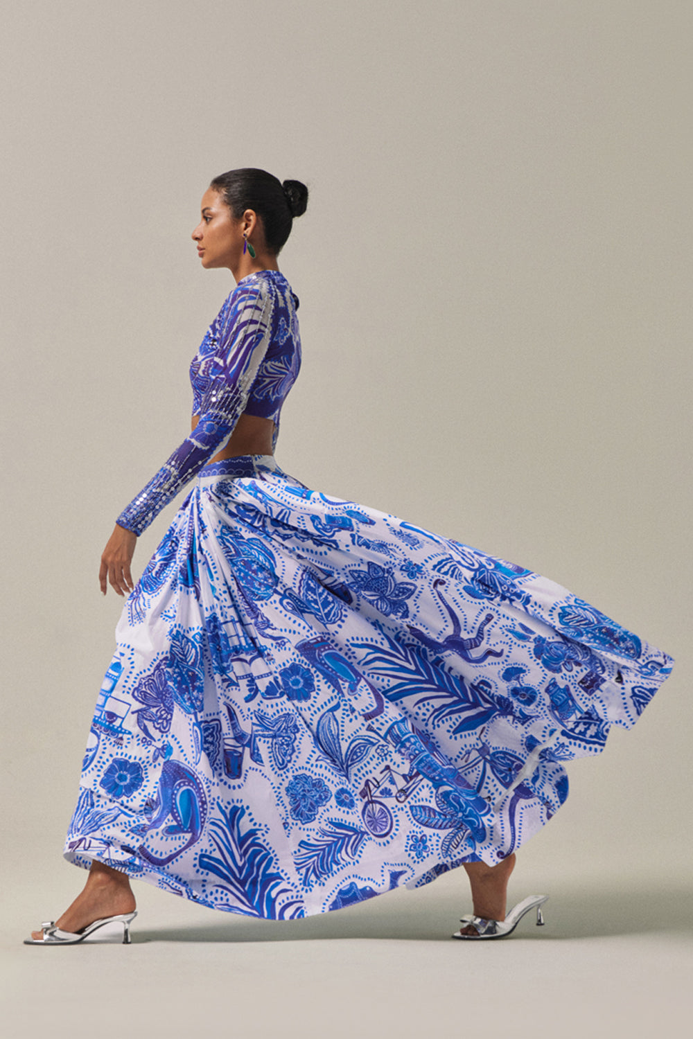 Crop tops that slay. The Amb…ôr Crop Top from Ani is crafted from stretchable net fabric in our stunning indigo and white, Jaipur inspired print. The hand embroidery on the neck and sleeves adds intricate detail, making it a standout piece. Pair it with our ÄòChai Biskut Carnival skirtÄô for a modern-day bridesmaid look, or pair it with blue jeans for a casual night out, dancing with the girls.