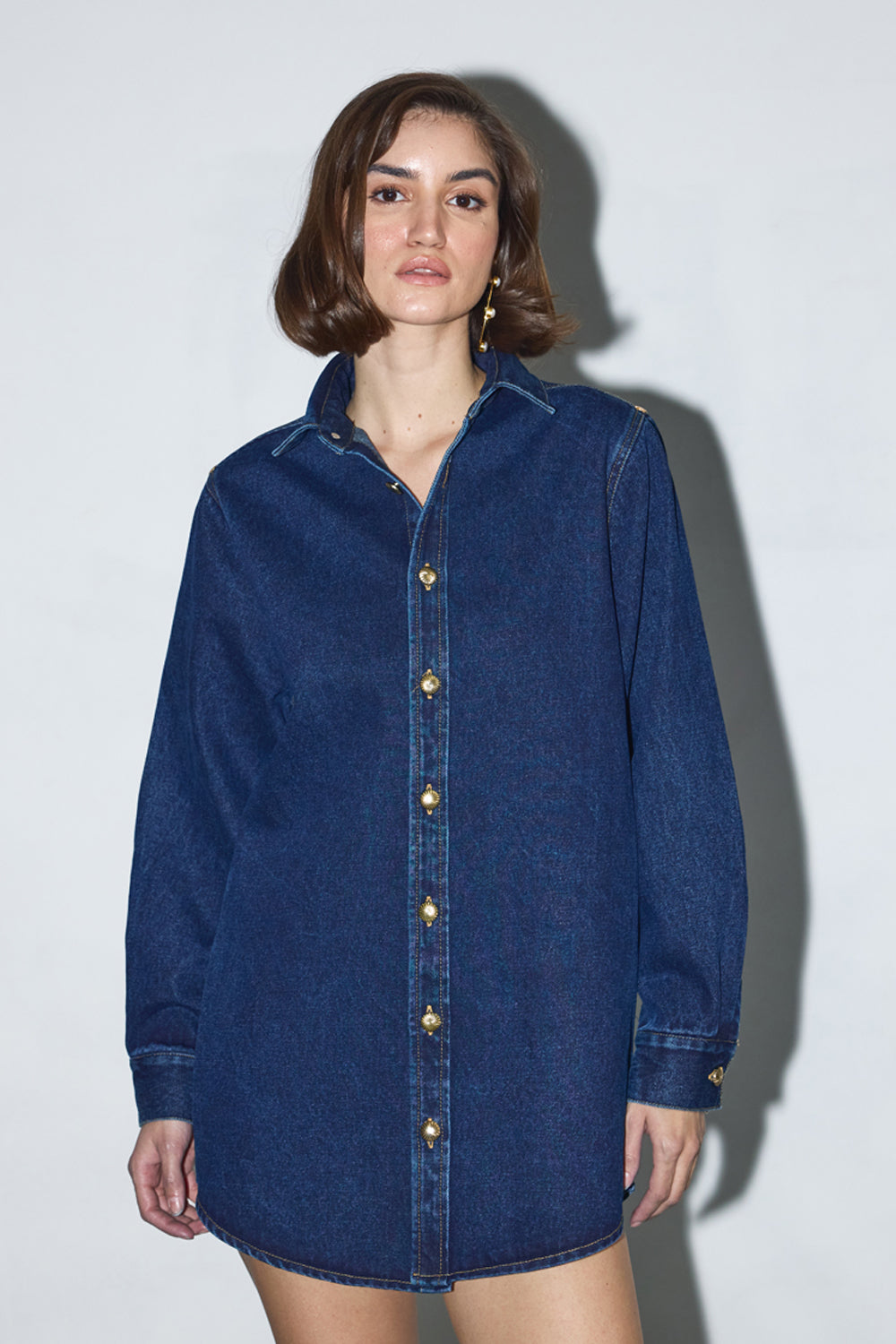 This denim button-down shacket drapes effortlessly over the body, its full sleeves billowing with grace. The sharp collar adds a subtle touch of structure, while the loose fit creates an easy, laid-back elegance. With every movement, it whispers of comfort and style, making it the perfect blend of relaxed charm and timeless appeal.
