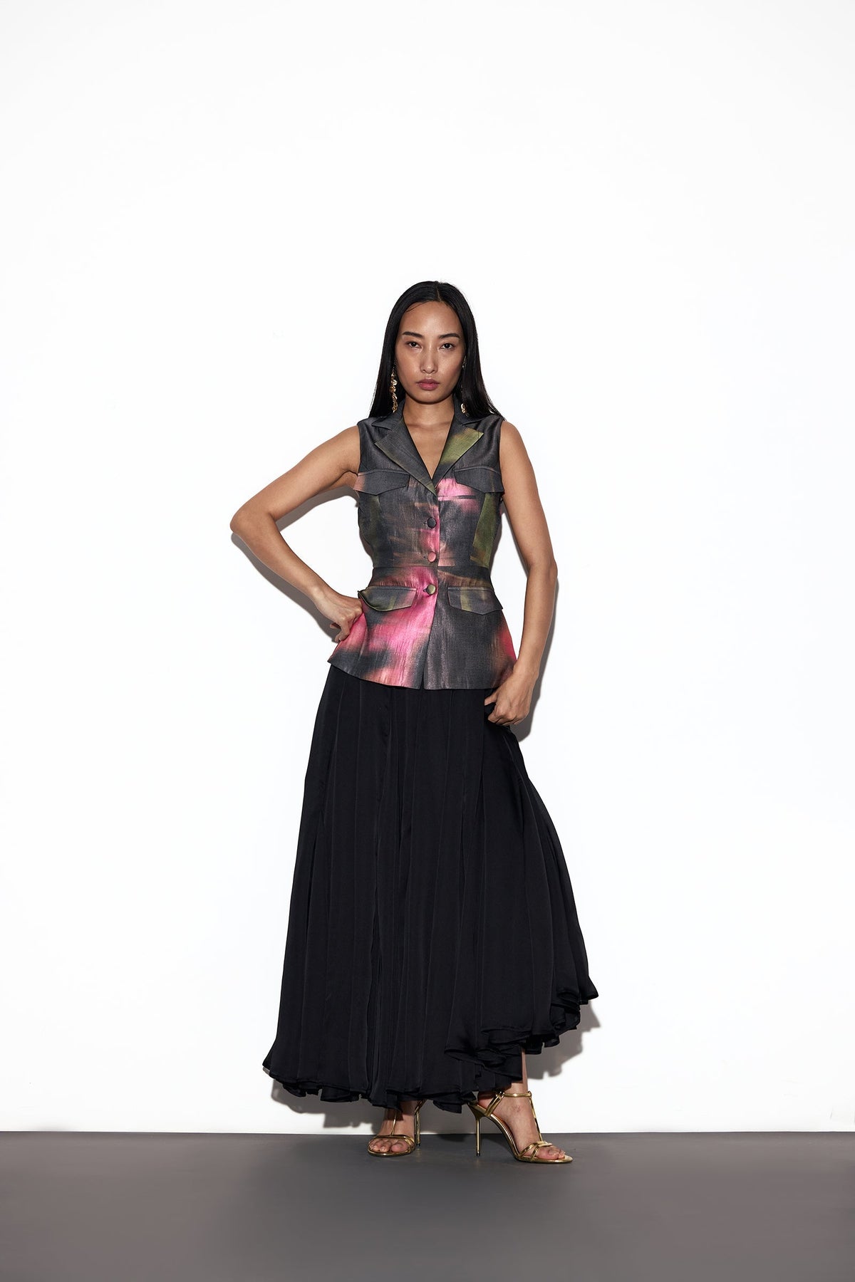 The MOCHI JACKET is tailored minimalism with a touch of charm. Sleeveless and structured with a classic notch collar, it carries an effortless sophistication. Faux pocket flaps add subtle detail, while fabric buttons down the front complete the look with quiet refinement. A versatile piece that slips easily between layers, it balances simplicity with timeless elegance.