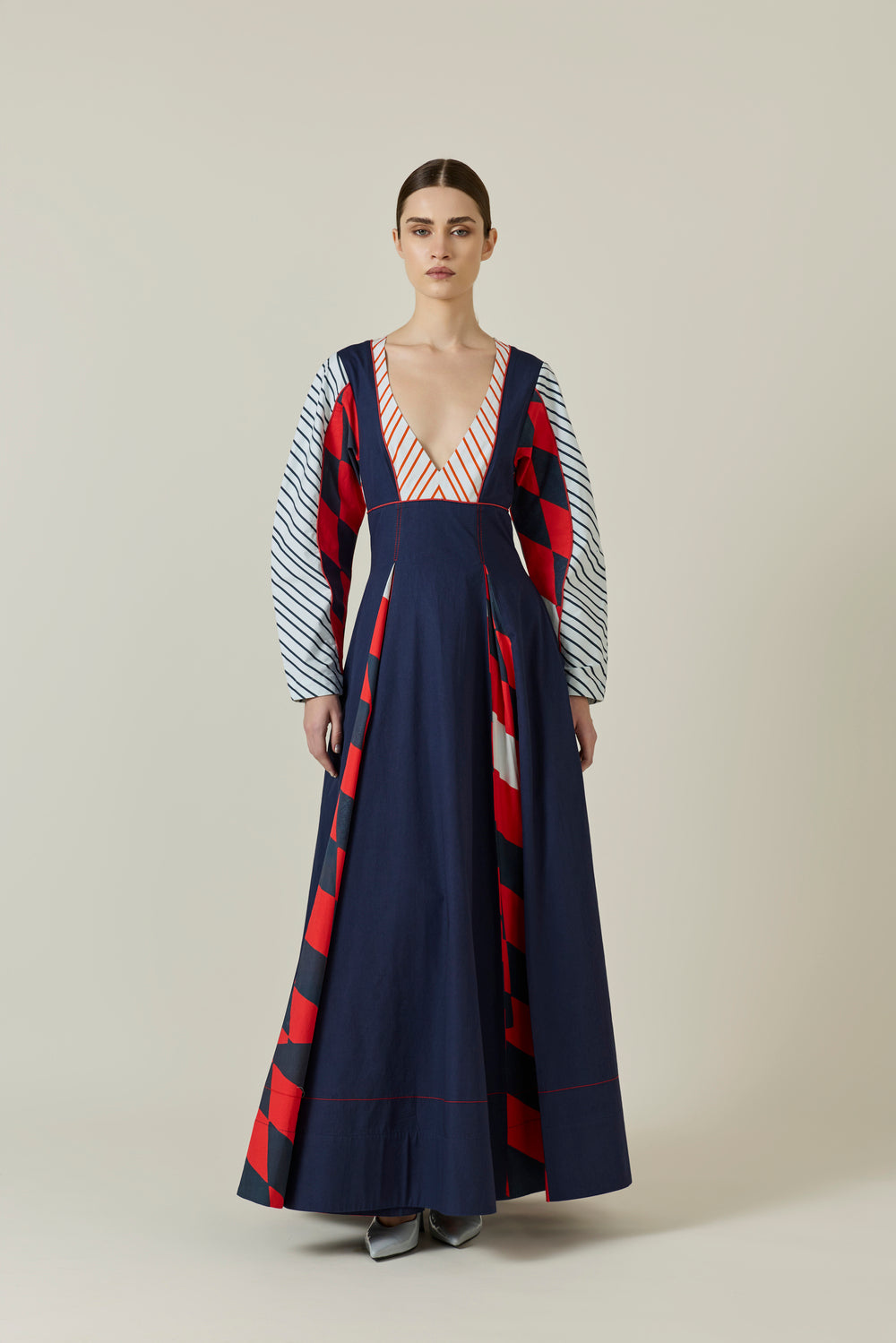 Quiet strength, a flash of spirit and a shape that moves with you—HILDA by ANI is a sculptural colour-blocked dress with a gently curved neckline and a pleated skirt that carries movement. Panelled, piped sleeves lend structure to the silhouette. Worn best with clean flats and an open afternoon—a gallery date, a solo lunch, or when you need to stand apart.