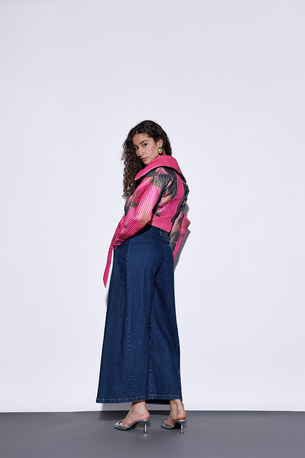 The SHIBURU TOP is a statement of layered elegance and contrast. The inner layer, crafted in denim, features a structured standing neckline with a front golden button closure, lending strength and refinement. Over it rests the printed outer layer, designed with an exaggerated notch collar for bold charm. Full sleeves with cuffed ends and fabric button closures add tailored precision, while the hem falls in a soft puff silhouette, creating a balance of structure and fluidity. A piece that blends playfulness with sophistication, making it versatile yet striking.