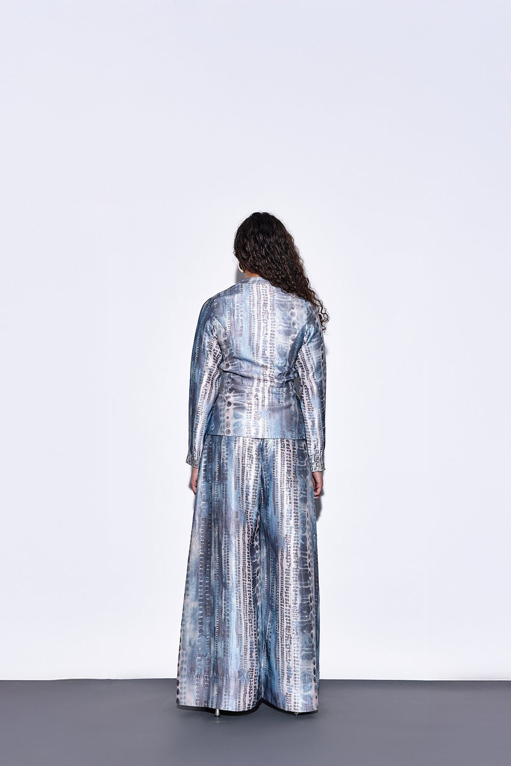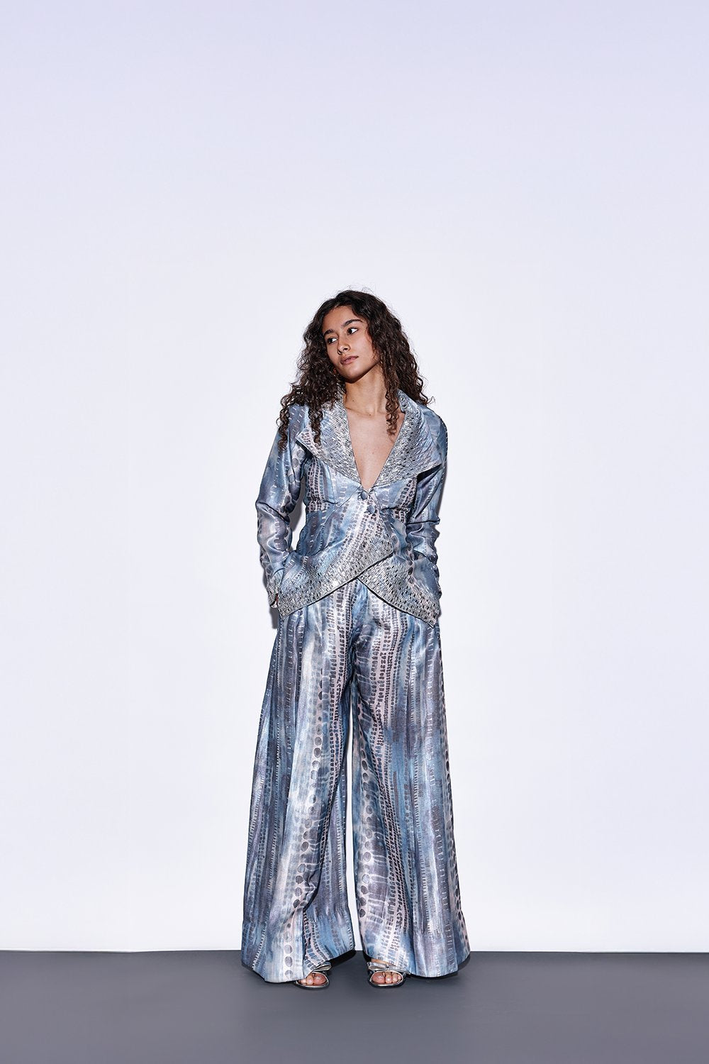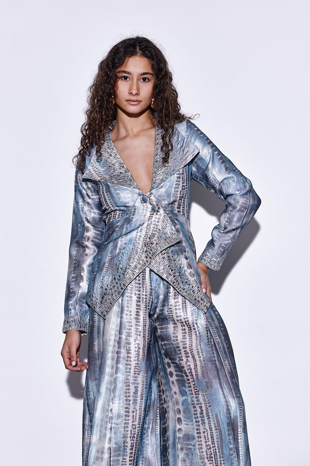 The KMOYO SET captures the essence of bold elegance and effortless grace. The Kmoyo Jacket redefines power dressing with a deep V-neckline and exaggerated lapel that command attention. Asymmetrical overlapping panels below the waist add a touch of modern drama, while full sleeves and fabric buttons balance the look with timeless sophistication. Silver sequins and beads trace the neckline, waist, and sleeves, shimmering like constellations against the night sky. Paired with the Kmoyo Trousers, designed with soft pleats, a golden button, and zipper closure, the set flows with relaxed charm. Its baggy fit and side pockets offer an easy elegance, making this ensemble a perfect harmony of structure, shimmer, and style.